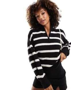 French Connection Half Zip Cropped Knitted Jumper In Black And White Stripe For Women Black/white